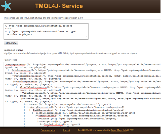 As depicted in the figure below the service returns the canonical form of a given query. Furthermore the parse tree is given. In the case the given TMQL query is not valid, the parse error is returned in details.