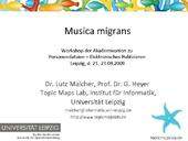 In der ersten Phase von „Musica migrans“ (http://www.musicamigrans.de) arbeiteten von August 2007 bis Juli 2008 das Institut für Musikwissenschaft und das Institut für Informatik an einem webbasierten, dezentralen System zur Erfassung der Biographien deutscher Musiker im östlichen Europa und östlicher Musiker in Deutschland. Die Datenerfassung und Eingabe erfolgte durch 28 musikwissenschaftliche Forscher in Ost- und Mitteleuropa.